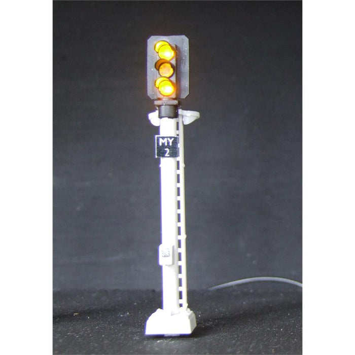 A 4mm scale 3 aspect Yellow/Green/Yellow colour light signal complete with an interface board and integral DCC decoder for digital operation. It can also be used with a DC power source.