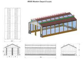 Modern 8 Window Motive Depot. This kit comes complete with 8 side bays and three ends (2 open, 1 closed). An Extension Kit (Heljan 9501) is available to increase the length of this depot.