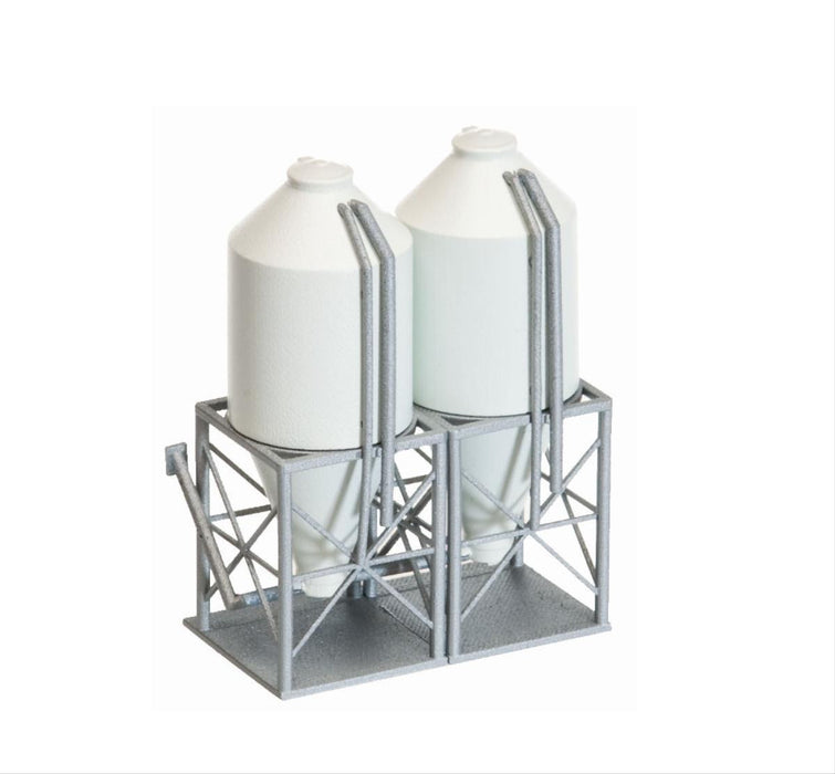 This is a pre-coloured OO scale plastic kit of two small silos typically found on farms storing feed and other granular material. Moulded in two colours, additional painting will really bring this kit to life.