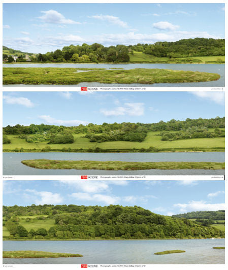 We are pleased to announce our new photographic backscene range, the first one being that of a river valley scene based on the River Axe in Devon. Supplied in a square-section tube, the three separate sheets will match perfectly together to form a continuous run of 2400mm (95in), and reaching to a height of 333mm (13in). Future backscenes will match at either end allowing longer runs of scenery throughout the full length of a layout.