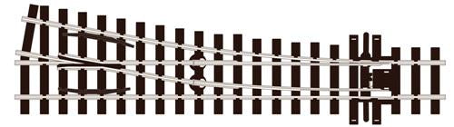 Medium Radius Turnouts. R/H Elecrofrog. Nominal radius:508mm, Angle:10 degrees, Length: 160mm. Metre gauge is widely used for the senic swiss mountain routes and also for minor lines in Germany, France and Portugal. Colonial lines in Africa, India, South East Asia and south America were also built to metre gauge. 12mm gauge track will also conveniently represent the 3''6" track used in southern Africa