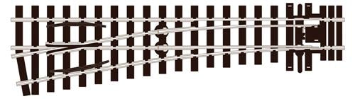 Medium Radius Turnouts. L/H Elecrofrog. Nominal radius:508mm, Angle:10 degrees, Length: 160mm. Metre gauge is widely used for the senic swiss mountain routes and also for minor lines in Germany, France and Portugal. Colonial lines in Africa, India, South East Asia and south America were also built to metre gauge. 12mm gauge track will also conveniently represent the 3''6" track used in southern Africa